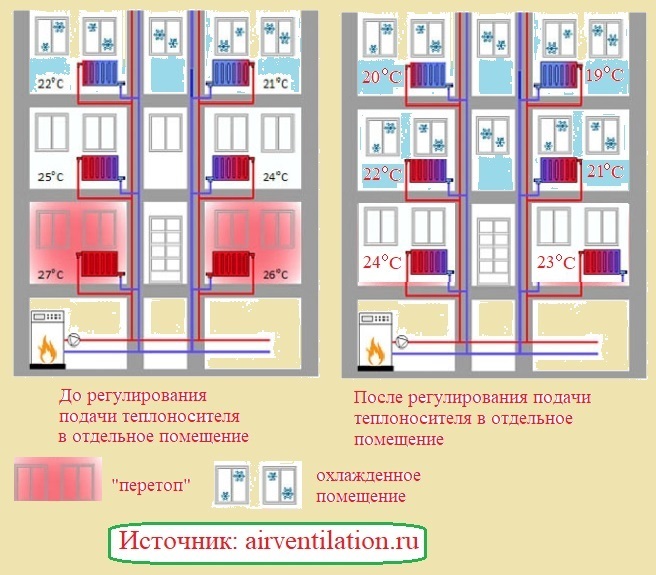 Возможно, что оптимизацию работы бытовых приборов, освещения помещений можно только приветствовать. Однако, отключение отопления или даже регулировка его режима работы в одном или нескольких отдельных помещениях многоквартирного жилого дома, многоэтажного офиса, - неприемлемы, поскольку нарушают общий тепловой баланс всего здания и "охлаждают" соседние с ними помещения, см прилагаемый рисунок.