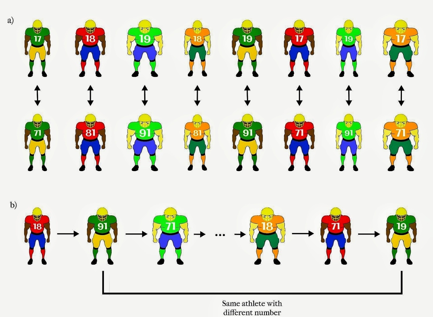 Респондентам показывали сгенерированные компьютером изображения игроков в одинаковых позах — но с разными размерами тела и цветом кожи — и просили оценить их стройность. Испытуемые видели каждого игрока дважды — по одному разу каждого в футболках с высокими и низкими номерами. В целом, игроки в футболках с номерами от 10 до 19 воспринимались как худощавые, чем игроки в футболках с номерами от 80 до 89, независимо от размера их тела и цвета кожи или майки.