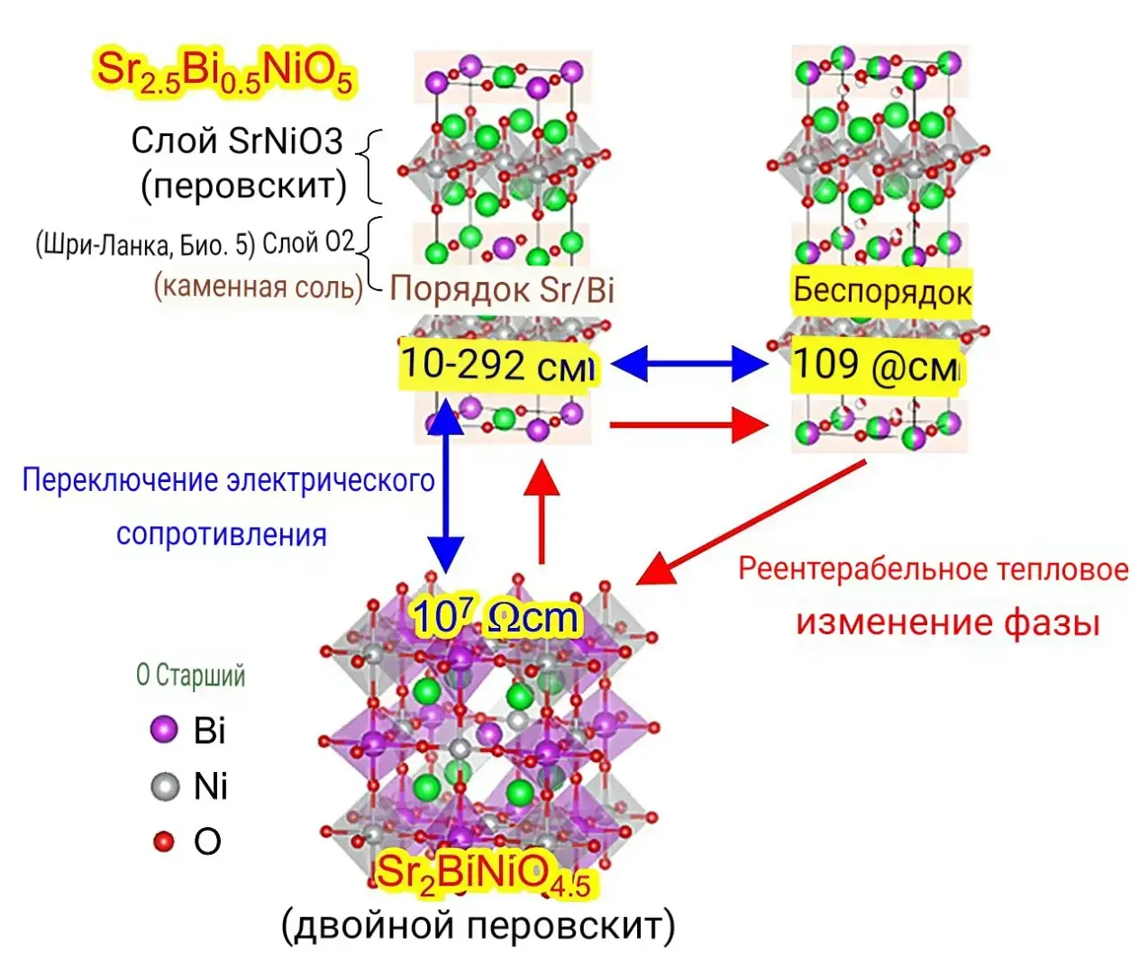 Особый слоистый никелат исследователей состоит из слоев атомов стронция, висмута и кислорода в структурном расположении "каменной соли", чередующихся со слоями молекул атомов стронция, никеля и кислорода в структуре перовскита. Перовскиты определяются специфической кристаллической структурой из двух положительно заряженных атомов и одного отрицательно заряженного и обладают рядом интригующих свойств, от сверхпроводимости до сегнетоэлектричества — спонтанной электрической поляризации, которую можно обратить вспять приложением электрического поля.