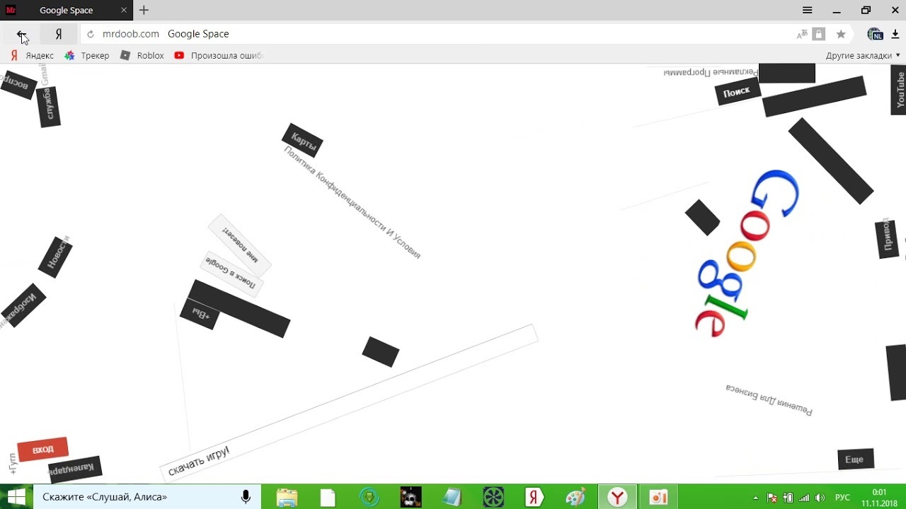 И чтобы попробовать нечто связанное с гравитацией, просто введите "Google gravity" в поиске, затем нажмите на кнопку "Мне повезет!" и наблюдайте, как все элементы интерфейса начнут падать и разбиваться. Вы сможете хватать и перемещать каждую деталь интерфейса мышью и создавать свои собственные хаотические сцены на экране.