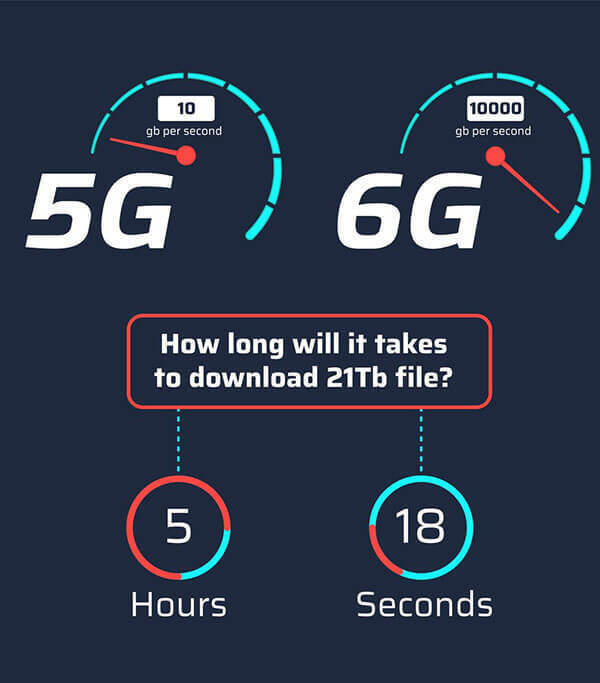 Скорость 6G ожидается на порядок выше, чем у 5G. Если 5G позволяет передавать данные со скоростью до 20 Гбит/с, то 6G сможет обеспечивать скорость до 1 Тбит/с. Это означает, что загрузка фильма в высоком качестве займет всего несколько секунд.