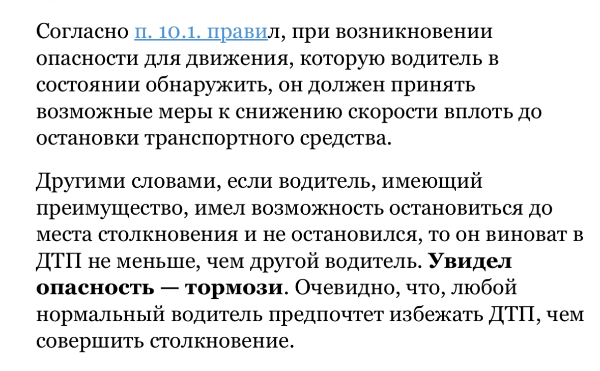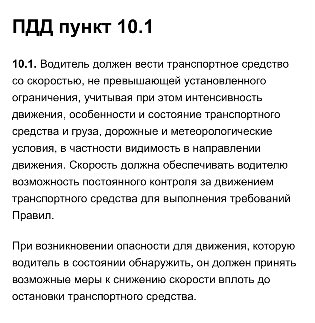 Предполагаем, что эта женщина не пыталась притормозить или маневрировать для предотвращения ДТП (или хотя бы для нанесения наименьшего ущерба), а тормозила чисто об нашу машину. В пункте 10.1 ПДД сказано, что, помимо скоростного режима, необходимо учитывать дорожную обстановку, препятствия и т.п, которые она не учла и усугубила ДТП.