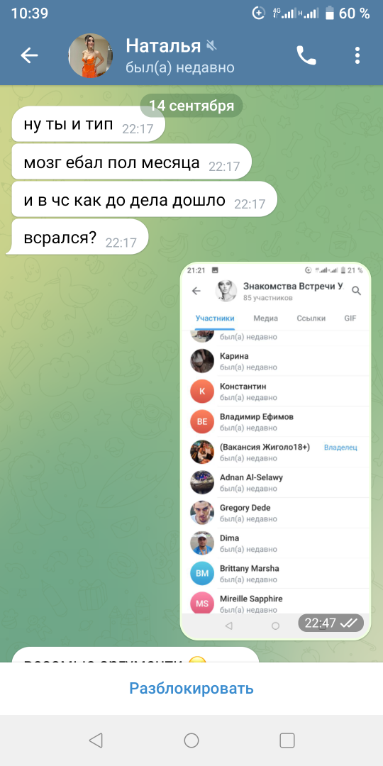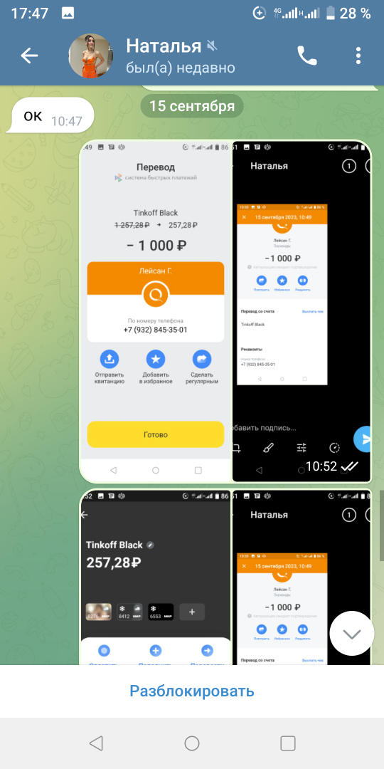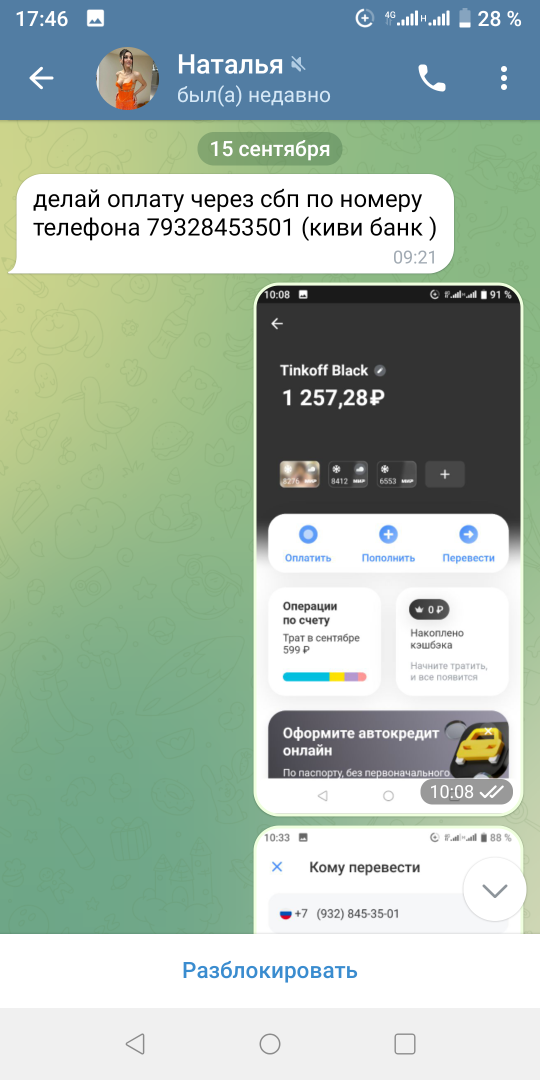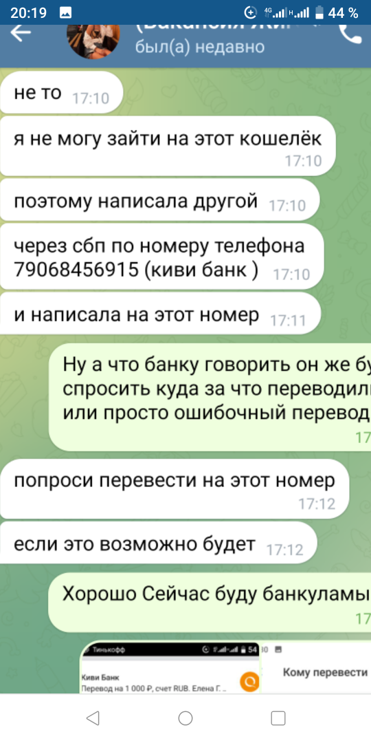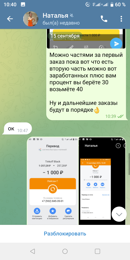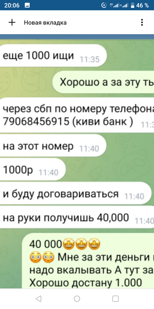 В общем в телеграме мне очередной раз развели А поточнее кинули на денежку суть одна особо предлагает заказы встречи и не только в общем на заказы она берёт 2.000 как вы оплачиваете заказ делаете в ней заказ переводите денежку едете на заказ готовитесь и в концовке облом не заказа ни денег в общем особый есть несколько страниц в телеграме есть скрины что она там говорит что за заказы есть у ней группы где там её подружки ну я выложить не могу из-за правил в общем есть в ней помощник водила то что вам помогает доехать до заказа до встречи номер машины есть как его звать тоже есть но хотя я выложить тоже это не смогу потому как правило сайта мне не позволяют этого сделать всё что есть в скринах я могу выложить заранее не рекомендую ей писать братьями заказы чистой воды развод на деньги как переведёте вы не увидите ни своих денег ни заказа и никакой не будет встречи