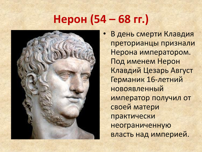 В 54 году Нерон стал императором Римской империи после смерти своего отчима, императора Клавдия. В начале своего правления Нерон был очень популярен среди народа благодаря своей щедрости и гуманности. Он отменил некоторые налоги, освободил тех, кто был в тюрьме за долги, и ввел новые законы, которые улучшили положение женщин и рабов.