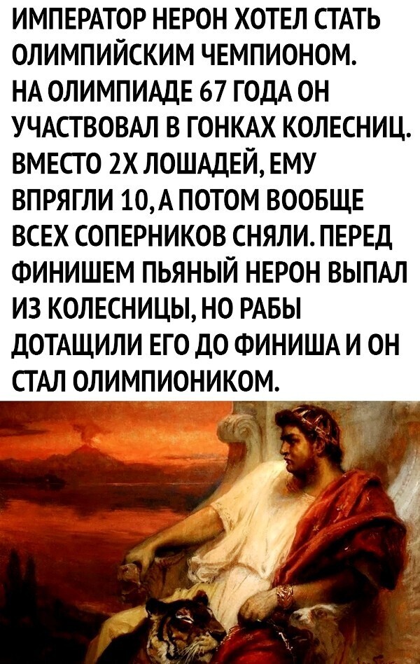 Одним из самых интересных фактов из жизни Нерона является его участие в организации огромного городского пожара в Риме в 64 году. Согласно легенде, Нерон играл на своей лире, наблюдая, как горит город. Однако это не имеет подтверждения в исторических источниках.