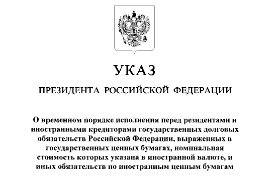 Президент России В. Путин 09.09.2023 подписал Указ № 665. В соответствии с данным Указом вводится временный порядок со стороны России по расчётам с госдолгом перед «внешними кредиторами» российского государства.
