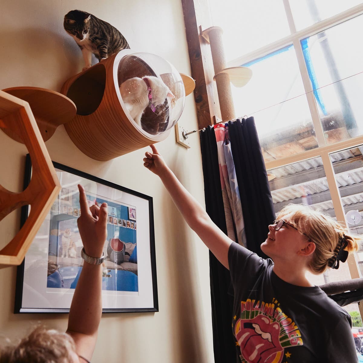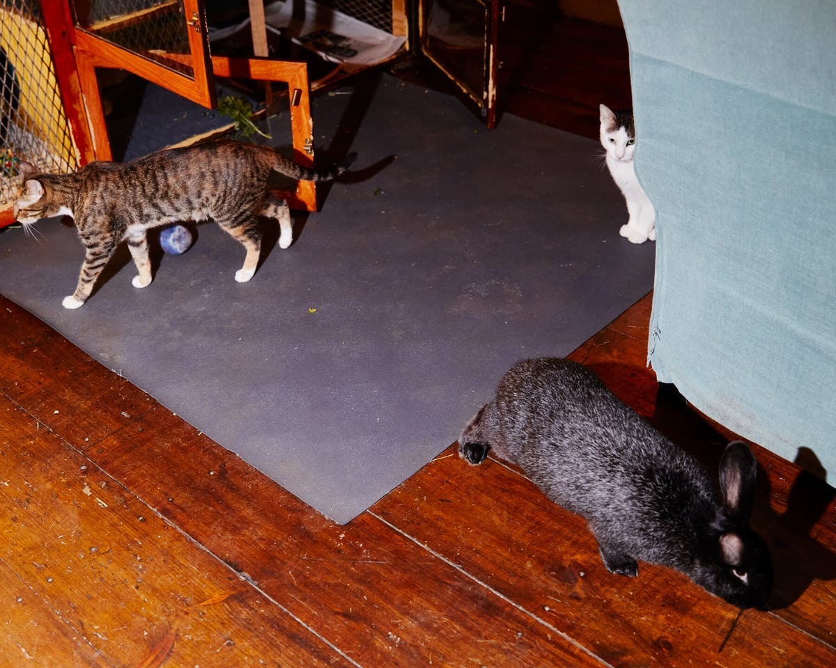 Клиенты могут приобрести корм для животных (и напитки в бутылках для себя) и пообщаться с целых 40 кошками, которые общаются с другими животными — кроликами, крысами, морскими свинками, собаками и, однажды, шиншиллой, — которые все готовы к усыновлению.