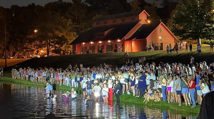 Крещение состоялось во вторник вечером на озере в заведении Auburn's Red Barn, которое расположено примерно в полумиле от Невилл-арены Обернского университета, где богослужение "Объедини Оберн" собрало огромную толпу.