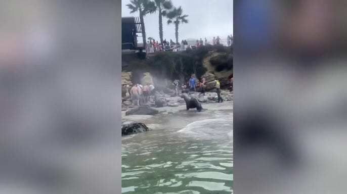 - "Пожалуйста, дайте этому большому самцу морского льва побольше места", - слышно, как спасатель говорит по громкоговорителю на видео. "Они кусали людей, и они являются защищенными животными".