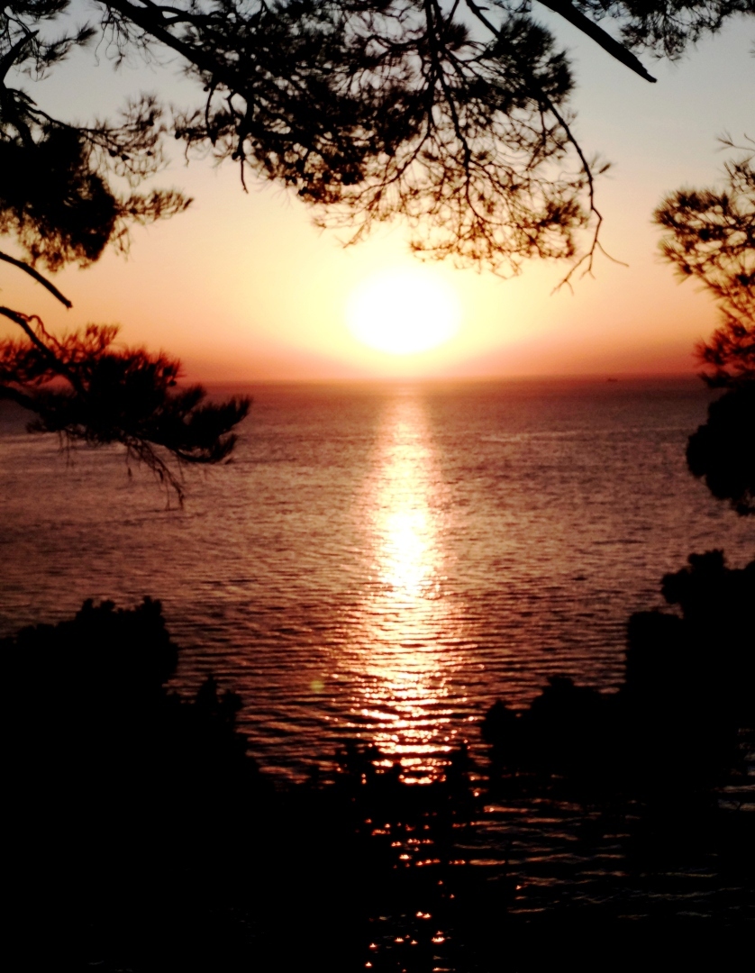 Море, орамленное заходящим солнцем и пицундскими соснами