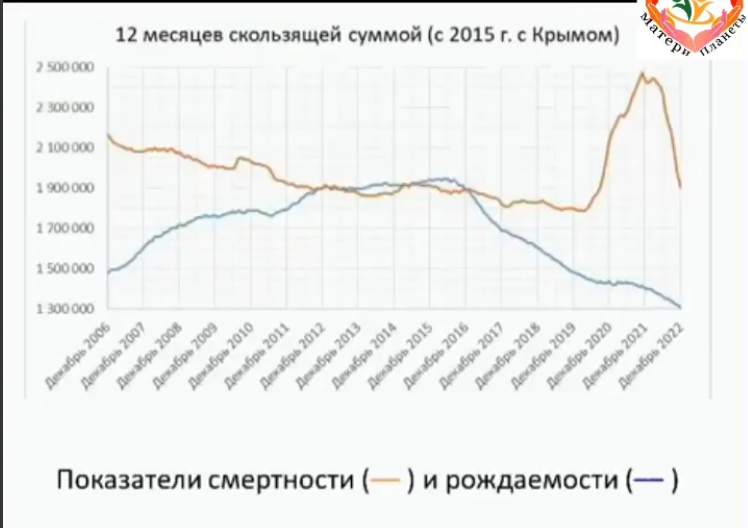 Синяя линия это рождаемость и даже несмотря на то, что мы присоединили Крым с 2015 года, наша рождаемость идёт вниз и идёт стремительно вниз.