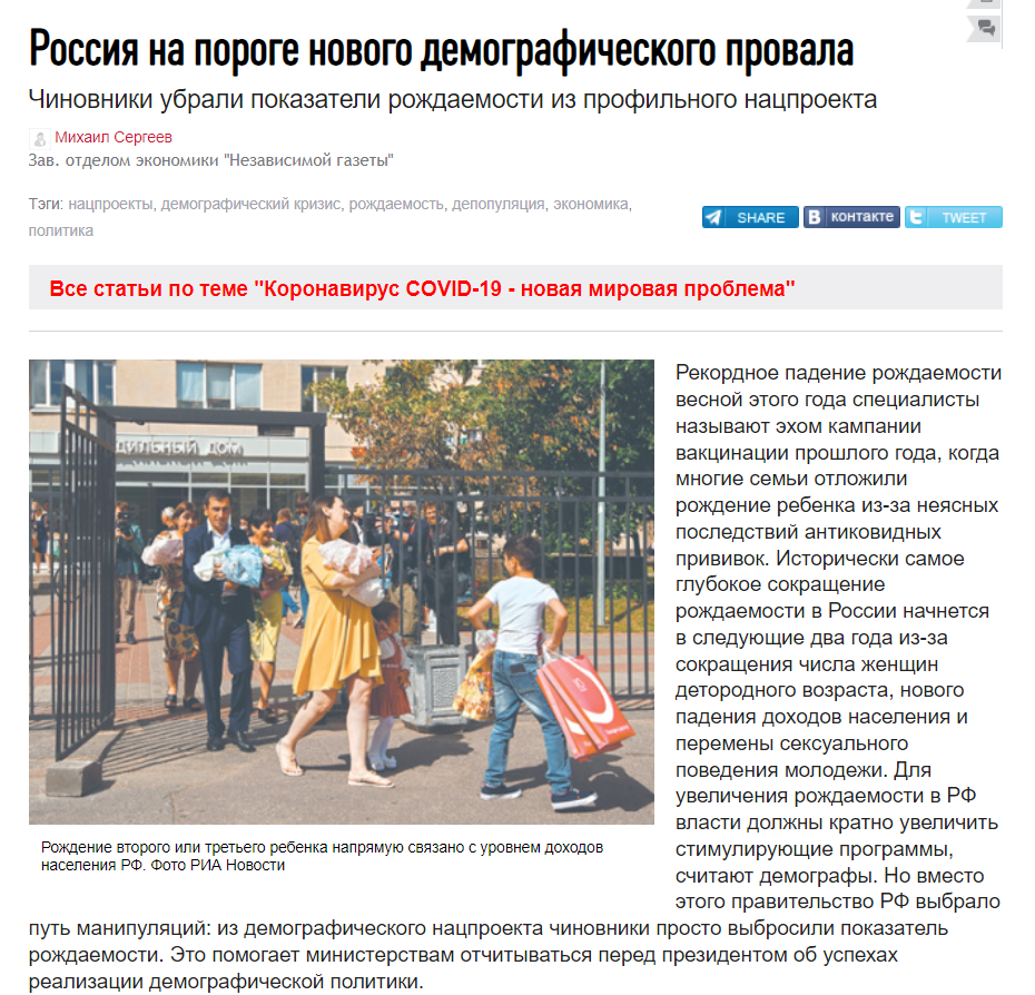 Мы действительно стоим на пороге демографического кризиса. Об этом пишут не только уже медики говорят. Это понятно, но уже и пишут просто журналисты, которые чуть-чуть начинают вникать в тему здоровья. И видите, что пишут это 2022 год. А, понимаешь ли, почему у нас рождаемость упала? А потому, что это последствия вакцинации!!!
