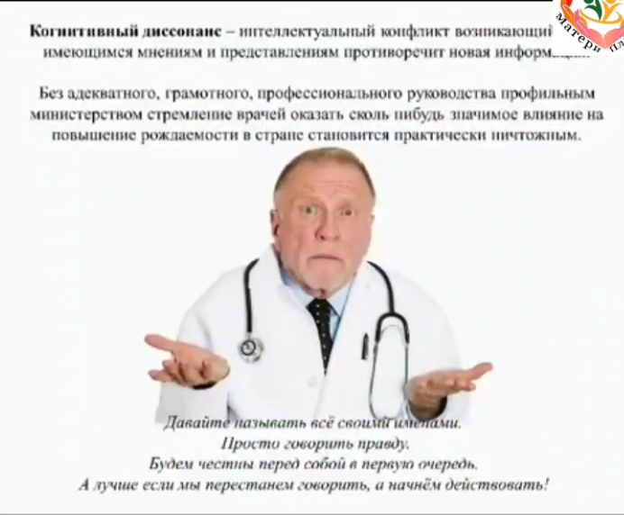 У всех, наверное, возникало одно чувство, несовпадение с тем, что слышите, с тем, что происходит. Это называется когнитивный диссонанс. Поймите, мы не сможем без адекватного, грамотного, профессионального руководства. Человека, который страдает, переживает за свою страну изменить ситуацию в демографии.