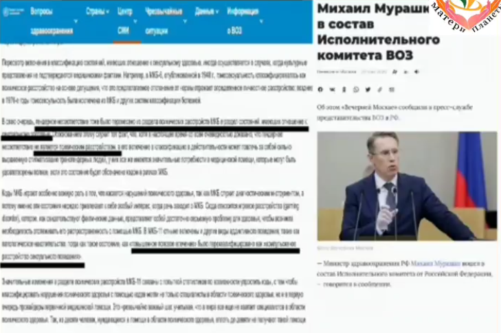 Опять некоторые моменты, это факты. Обратите внимание, с мая 2020 года, человек, исполняющий обязанности министра здравоохранения находится в исполнительном директорате коммерческой организации, которая именуется Всемирная организация здравоохранения. Это та организация, которая фактически существует и пропагандирует интересы больших фарм гигантов. Это та организация, которая сейчас приняла так называемую MКБ 11, в которой вот эти все перверсии, различные из разряда психиатрии переводятся, уже понимаешь ли в некоторые отклонения. Это там, где идёт жесточайшая пропаганда тех ценностей, которые нам противоречат. Которые никогда не принимались у нас в России, и этот человек находится там, и эти интересы нам сюда идут.