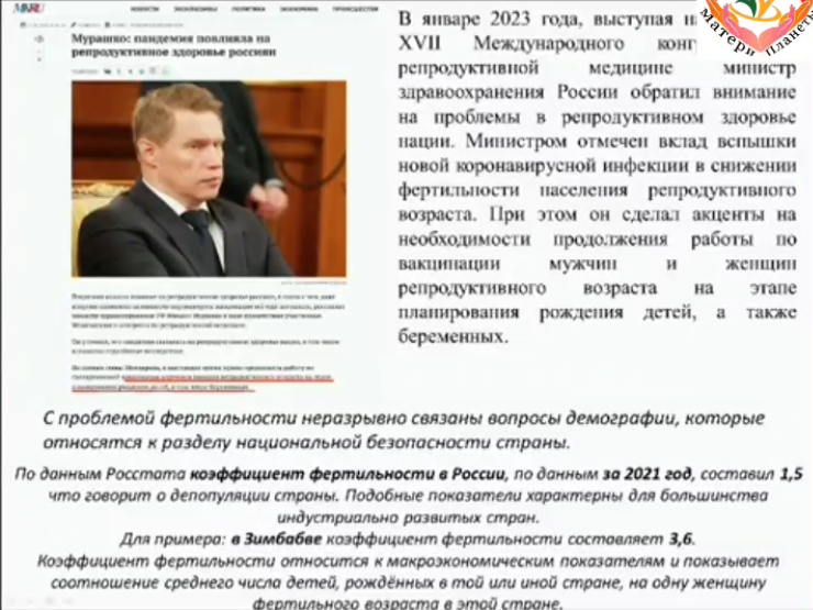 Вот смотрите, в январе 2023 года человек, который исполняет обязанности министра здравоохранения Российской Федерации, выступает на конгрессе по репродуктологии и говорит о том, что у нас существует действительно процессы, связанные со снижением фертильности и действительно есть проблемы репродуктологии. И дальше идёт одержимость это сатанинская. Да, что надо усиливать вакцинацию! Но как уж без неё? Ну уж если на этом уровне заговорили о том, что у нас есть проблемы в репродуктологии, но значит, действительно мы находимся в катастрофе.