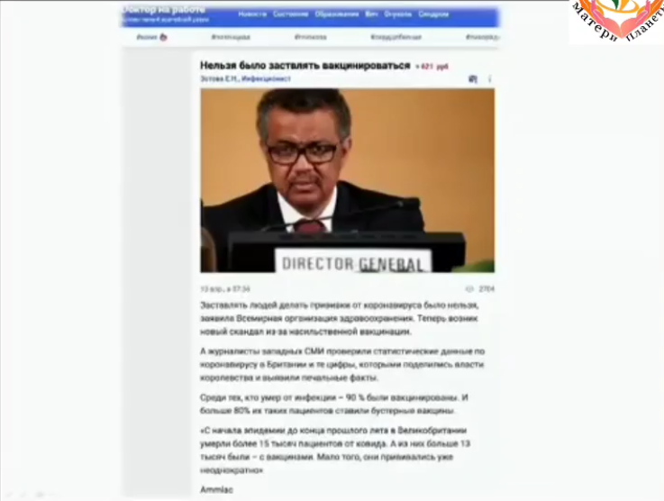 А сейчас этот Тедрос Аданом Гебреисус. Это тот человек, которого переизбрали. Я сейчас даже не буду останавливаться на этой личности. О чём они говорят? А вот понимаете ли ошибка, а не ошибку сделали, что заставляли вакцинироваться. Нельзя призывать к вакцинации!!! Но они не признают в том, что категорично глупость была в том, чтобы носить маски здоровым людям. Там ограничения и т д. и т п. Но посмотрите, пожалуйста, адепты же ведь вот этих методик они существуют и до сих пор.