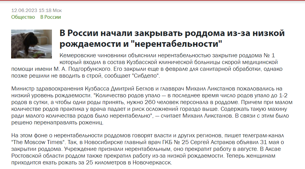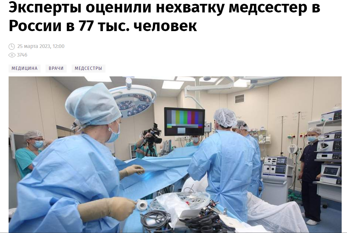 Смотрите, это "Российская газета", это "Известие" публикуют о том, это 2022 год, это 2023 год. Нет медсестёр, нет врачей, не хватает, что происходит? А вы знаете, что если нет медсестры, то и врачу делать нечего. Кто будет выполнять назначения? А что значит нет врача? Это значит нет акушера, нет гинеколога, который сможет принять роды для того, чтобы появился новый человек на свет. Понимаете, дальше пойдём смотреть