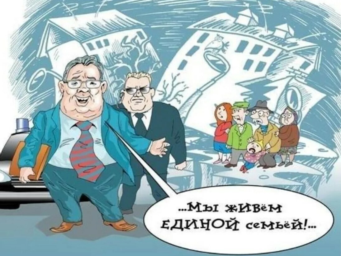 Когда чиновники, проживающие в квартирах по полмиллиарда рублей, трясут своими жирными щеками и толкуют о том, что всем придется затянуть пояса, это вызывает некоторое раздражение людей, которым уже некуда затягивать пояса. При этом, показывают нам лишь отдельные особо телегеничные фигуры. А сколько там невидимых сынков, дочек, зятьев, жен, любовниц, двоюродных сестёр и так до бесконечности? И все ведь пристроены, все при делах. У кого земля на Рублевке, у кого гостиницы в Греции. Но трогать никого нельзя, и даже задавать вопросы - неприлично. Может быть расценено как покушение на основы существующего строя.