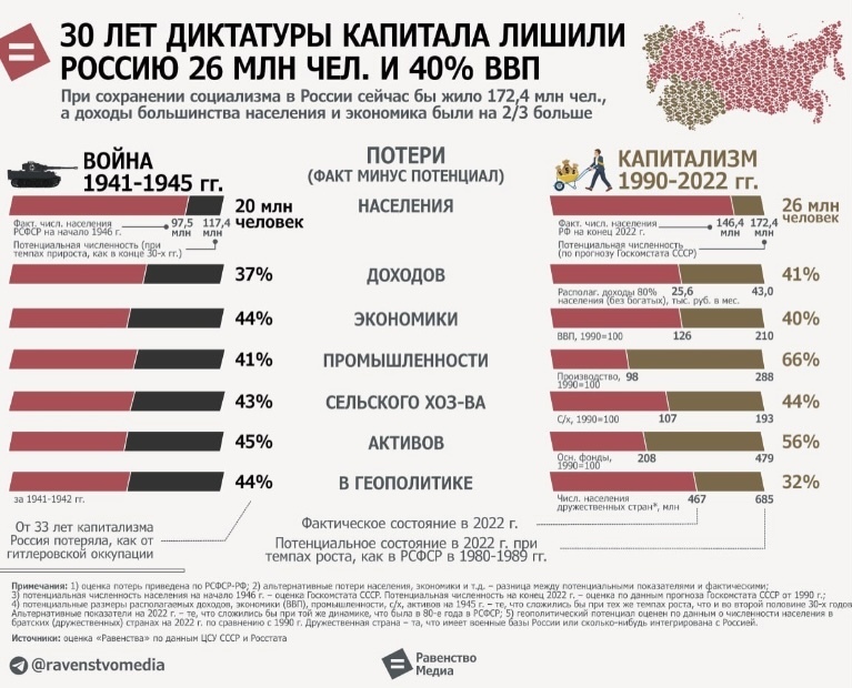 В России с момента развала СССР образовалась некая диктатура капитала, а ее влияние на ситуацию в стране негативно отразилось по многим направлениям. В некотором взгляде это можно сравнить с потерями СССР в период гитлеровского нашествия.