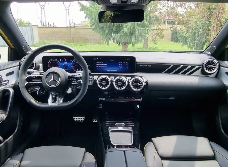 Интерьер нового A45 S AMG повторяет эстетическую линию рестайлинга немецкого компактного автомобиля. Вновь появились двойные 10,25-дюймовые экраны системы MBUX последнего поколения, с которых осуществляется управление мультимедийной системой и цифровыми приборами. Максимум возможностей для беспроводной связи с устройствами Android или Apple, а также наличие множества гнезд USB C, в том числе и для задних пассажиров. Материалы отделки, похоже, улучшились по сравнению с первым выпуском: сборка стала более качественной, а пластик - более прочным. Жаль только, что сиденья практически идентичны тем, что предлагаются в более распространенном A-Class с пакетом AMG Line. Новым стало рулевое колесо с двойными горизонтальными спицами и сенсорными кнопками. Не шедевр с точки зрения эргономики - есть риск случайно задеть некоторые функции, - но, безусловно, очень приятный для глаз, как и замшевая ткань на рулевом колесе.