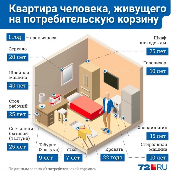 Исходя из нашей потребительской корзины 25% от суммы 15 669 рублей, получается целых 3 917 рублей. Человек должен спать на одной кровати минимум 22 года, швейная машинка проработать 40 лет, стол должен отслужить 25 лет. А, если, что-то сломается, например холодильник. То копить придётся 15 лет. А куда на это время складывать продукты?