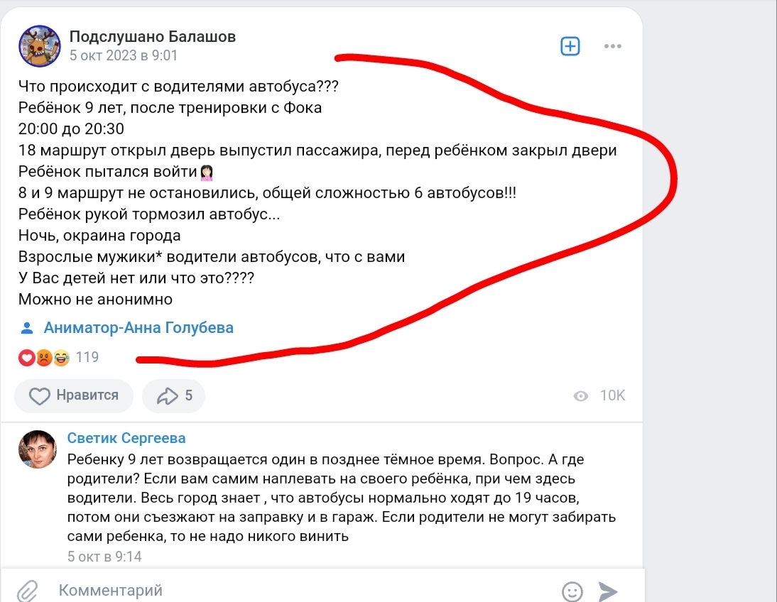 Мать сообщила в сообщество о том, что ее 9-летнего сына, поздно вечером возвращавшегося домой после тренировки, не пустили в автобус. Водитель автобуса, по словам матери ребенка, выпустил пассажира через переднюю дверь и закрыл её прямо перед мальчиком. Ребенок пытался остановить проезжавшие автобусы, махал рукой, но 6 автобусов проигнорировали его.