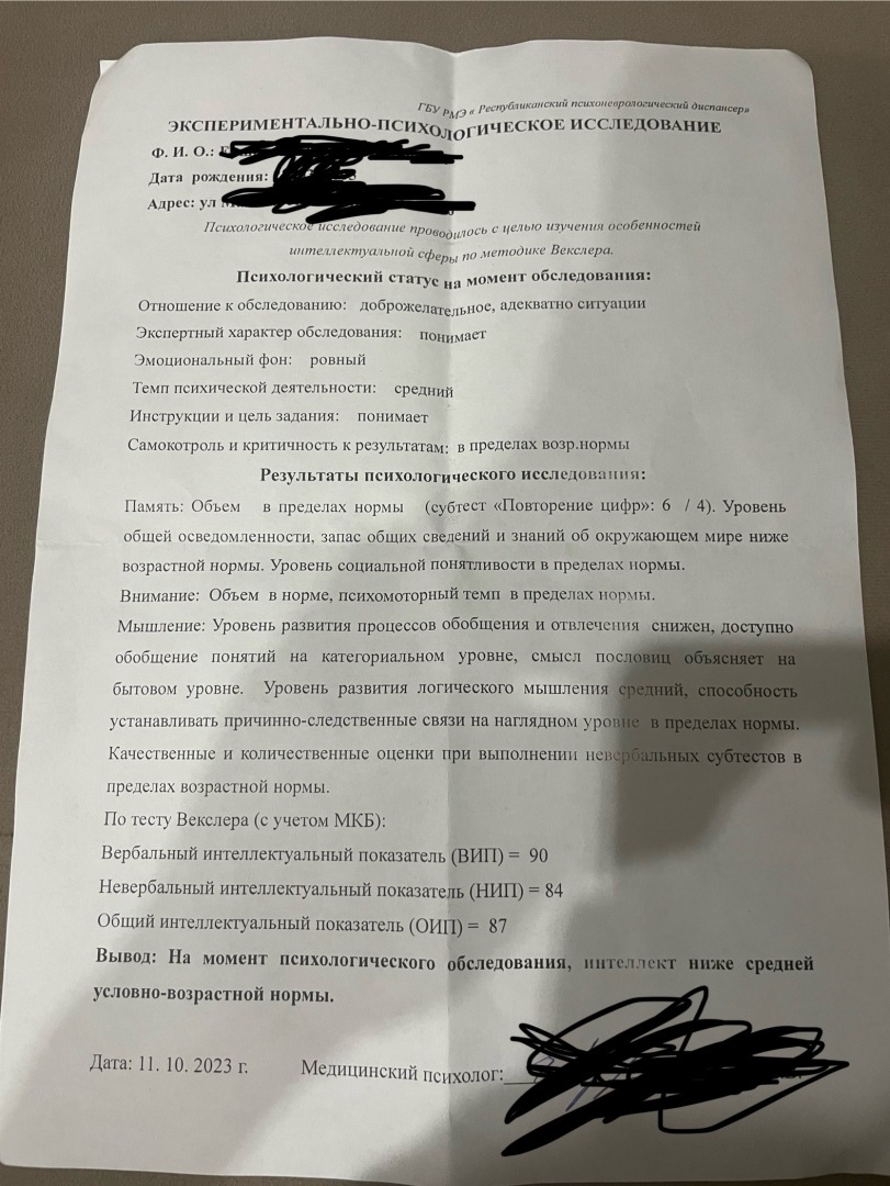 Заключение психолога у меня на руках, готов предоставить данные на рассмотрение.