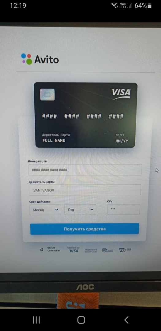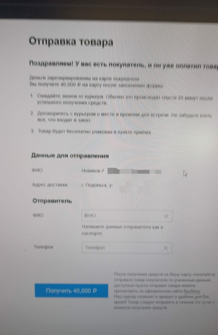 Далее покупатель задает уточняющие вопросы, и вот на этом моменте нужно проявить свою бдительность. Далее он сообщает, что хочет воспользоваться службой доставки самой торговой площадки или другими службами доставки. Покупатель-мошенник под видом оформления заказа и оплаты запрашивает у Вас ФИО, адрес электронной почты и телефон. После получения требуемых данных, к Вам на почту приходит уведомления якобы от площадки Авито, в котором Вам сообщается, о том, что на товар появился покупатель. Письмо содержит ссылка на фальшивый сайт. Это может быть любой сайт, который содержит название avito. В нашем случае это был сайт с доменом www.avito-cloud.ru. Сайт очень правдоподобно копирует основной сайт торговой площадки. В то же время Вам присылают скриншот якобы оплаты за товар. При переходе на сайт, Вы увидите скопированную картинку Вашего товара, размещенного на площадке, ФИО покупателя, данные, которые Вы сообщили мошеннику. Так же на странице содержится кнопка ссылка на страницу якобы получения денег. При переходе по ссылке Вас просят ввести данные своей банковской карты, в том числе и код CVV. (Ни в коем случае не делайте этого, сайт не несёт никакой ответственности за перевод ваших денежных средств и не сможет отследить кому вы их перевели)! Если совершить ошибку и ввести все требуемые данные, с указанной Вами карты будет произведено списание денежных средств в адрес неустановленных лиц.