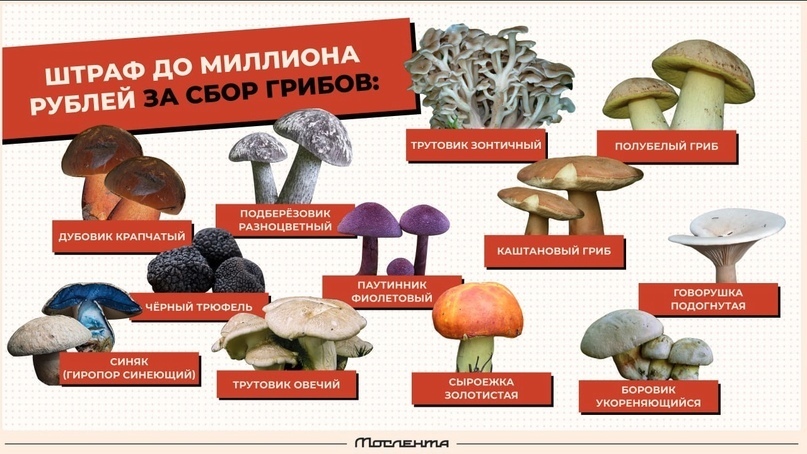 Отжав у КОРЕННЫХ Россиян основные природные ресурсы; Газ,нефть,кам.уголь,за бесценок продали корабельный лес и вот теперь добрались до приятных мелочей,которые дарит НАМ Природа! Как я понимаю,инициаторы таких провокаций,своих мозгов не имеют,они тупо перенимают подобное у западных идиотов! Дело в том что количество грибниц,никак не зависит от того,срезали-ли их или они остались на корню. Я сам грибник,в Самарской обл.не раз (в юности)ходил по грибы и знал точно их местоположение. Стало быть,сколько бы я не собирал в тех местах русские грузди,волнушки и прочие грибы,меньше их не становилось! Конечно,было годовое различие их количества,урожайный год или не нет,но не более. Так вот применение таких законов,явное превышение власти! Таких депов в тюрьму,как врагов и предателей своих избирателей,доверивших им государство.Которые ОБЕЩАЛИ быть внимательными и заботливыми НАРОДНЫМИ избранниками,только их за-коны идут явно во вред населению. Вот несколько таблиц по штрафам:Картинка говорит сама за себя,но еще надо добавит что есть ещё и уголовная ответственность,тюрьма до 9 лет! Бывают случаи когда за убийство человека дают меньшие сроки,чем за гриб.