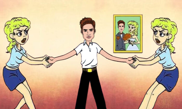 На представленном изображении разворачивается своеобразная сцена: мужчина оказывается втянутым в перетягивание каната между двумя женщинами, обе утверждающими, что они его жены.