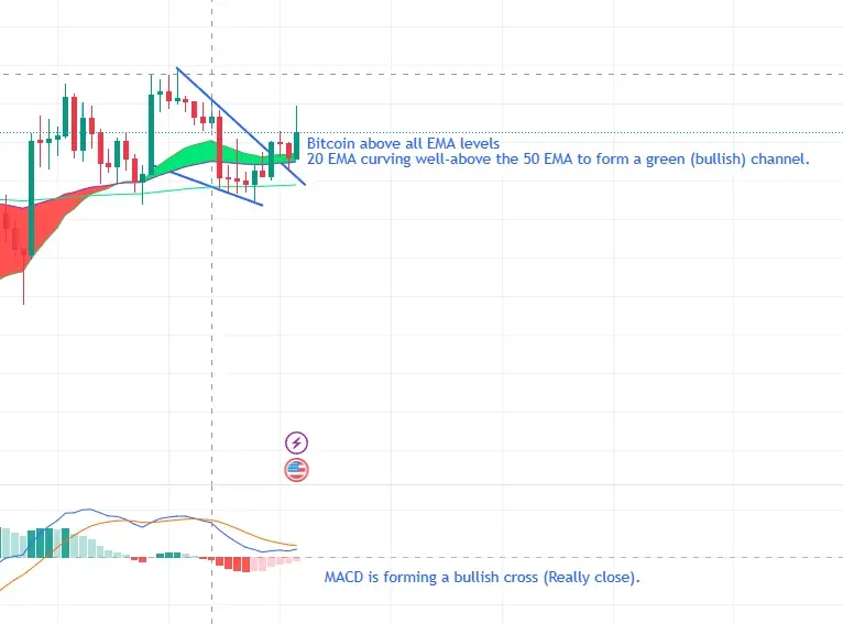 На 24-часовом графике RSI снова находится на территории, близкой к перекупленности, вместе с MACD, образующим бывший крест. Хотя RSI несколько медвежий, бычье пересечение только того, что сформировал MACD, указывает на то, что Биткойн, скорее всего, сохранит сильный восходящий тренд. Кроме того, ралли заставило Биткойн вернуть себе поддержку регионов 200, 20 и 50 EMA. Кроме того, теперь 20-ЕМА, скорее всего, означает 50-ЕМА, образуя выше бычий канал. В целом, дневной график выглядит очень бычьим и указывает на приближение сильного восходящего тренда.