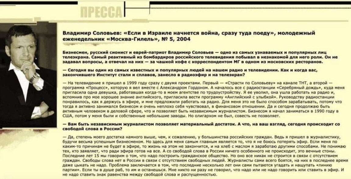 В глобальной сети было обнаружено интервью 2004 года с участием Соловьева, в котором он пообещал поехать в Израиль, если в стране развернется война.