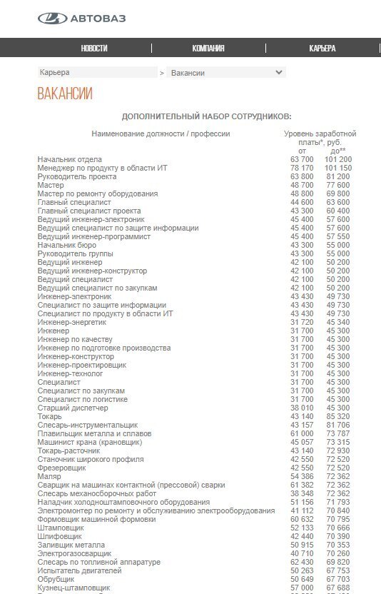 И действительно, в подтверждение ее слов открываю официальный сайт АвтоВАЗа и вижу длинный список вакансий. Кто там только не требуется от мастера до начальников. Вот часть этого списка: