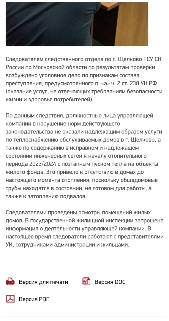 По данным следствия, должностные лица управляющей компании в нарушение норм действующего законодательства не оказали надлежащим образом услуги по теплоснабжению обслуживаемых домов в г. Щелково, а также по содержанию в исправном и надлежащем состоянии инженерных сетей к началу отопительного периода 2023/2024 с поэтапным пуском тепла на объекты жилого фонда. Это привело к отсутствию в домах до настоящего момента отопления, поскольку общедомовые трубы находятся в состоянии, не готовом для работы, а также к затоплению подвалов.