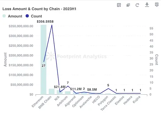 Как и ожидалось, DeFi остается наиболее закрытой нишей для криптохакеров. Отчет Footprint Analytics показал, что из общей суммы потерь в 471,4 миллиона долларов в первые полугодия 2023 года на долю DeFi пришлось 292,6 миллиона долларов, что составляет примерно 62%.