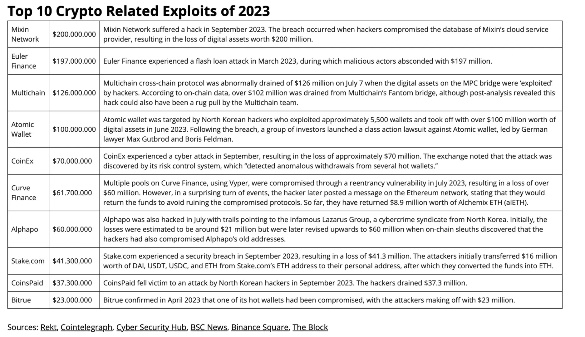 Несмотря на сопротивление, чинимые режимы США и других властей мира, северокорейские хакеры, в частности группа Lazarus, оставались активными на протяжении всего 2023 года. Из 10 крупнейших взломов в этом году группа Lazarus предположительно построила как минимум четыре, включая Wallet (100 миллионов долларов), Alphapo (41,3 миллиона долларов), Stake.com (41 миллион долларов) и CoinsPaid (37,3 миллиона долларов).