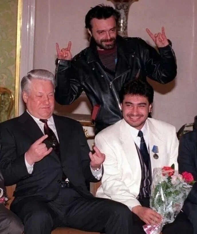 А это фото было сделано уже в начале "святых 90-х годов", или точнее - в 1993-м. На нем рокер Константин Кинчев делает "козу" на пару с президентом Борисом Ельциным во время его встречи с тогдашними деятелями культуры. Позже Кинчев расскажет, что на это мероприятие его привезли с сильного похмелья и он не вполне осознавал, куда едет. Впрочем, очень похоже что Борис Николаевич пребывал в примерно таком же состоянии..