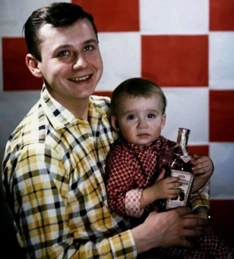 А это - актер театра "Современник" Олег Табаков с сыном Антоном в начале 1960-х годов. Он играл там с 1957 по 1983 годы и впоследствии стал одним из ведущим артистов. Его первой женой стала актриса Людмила Крылова, с которой Табаков прожил 35 лет.