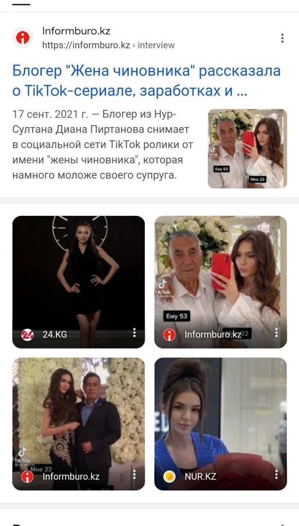 Блогер из Нур-Султана Диана Пиртанова снимает в социальной сети TikTok ролики от имени "жены чиновника", которая намного моложе своего супруга. На видео она показывает дорогие подарки, машину, украшения и другие атрибуты роскошной жизни. Видео девушки быстро набрали популярность, каждый ролик набирает тысячи комментариев. Некоторые пользователи относятся к роликам с юмором, а кто-то осуждает девушку за подобный образ жизни. Интриги добавляет и тот факт, что неизвестно, кем на самом деле является мужчина в роликах Дианы.