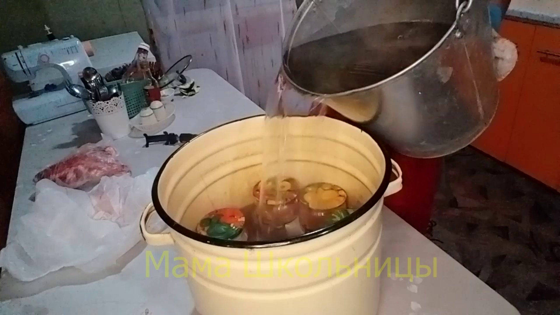 11. Настала пора отправить наши банки в большущую емкость и залить их водой так, чтобы крышки были скрыты. Я воду заранее вскипятила, так получится быстрее. Именно поэтому наливаю воду половником.