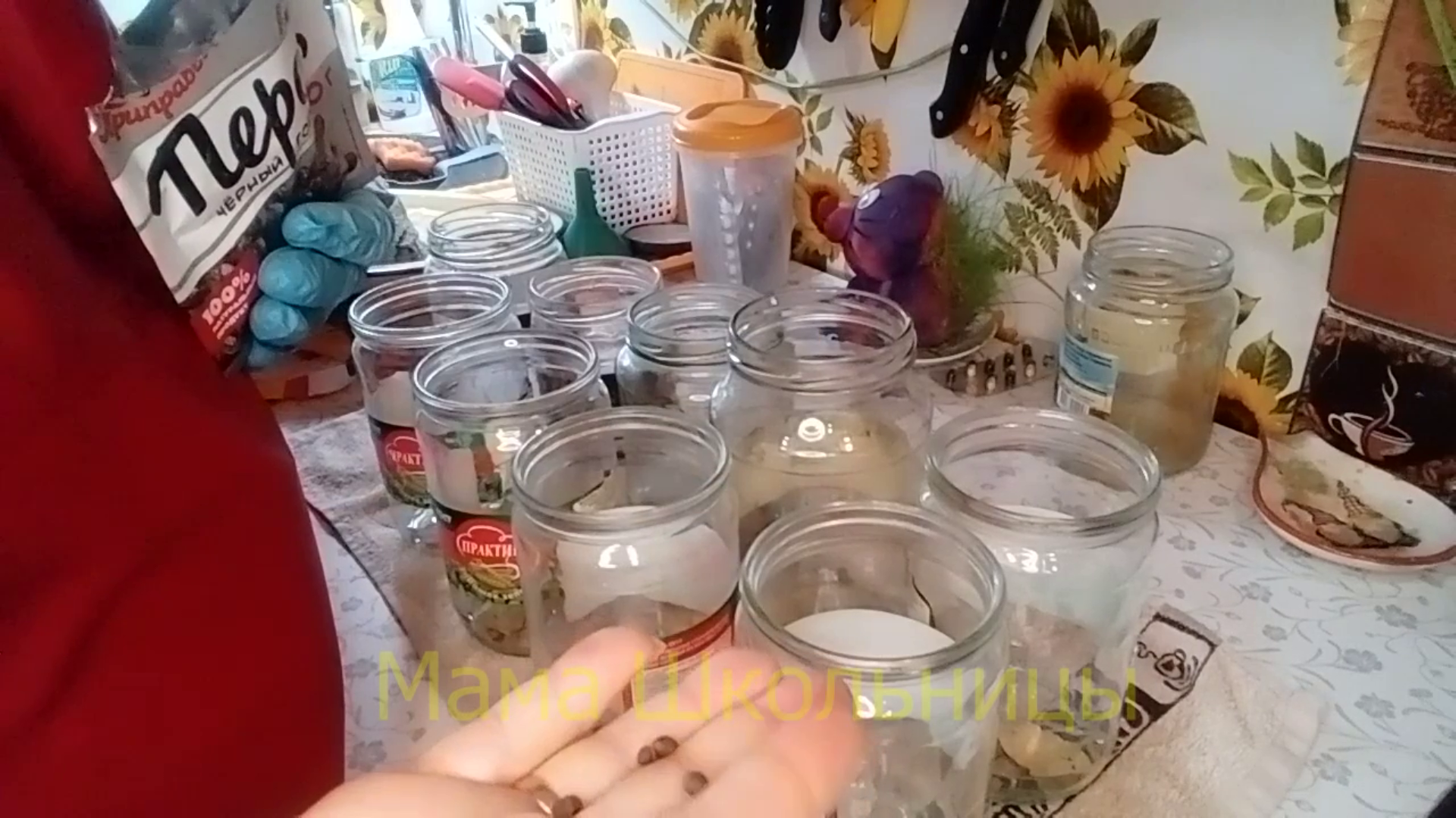 8. На дно баночек я укладываю по одному лавровому листу, три душистых перца, четыре-пять перца черного. Весь перец горошком, друзья мои.