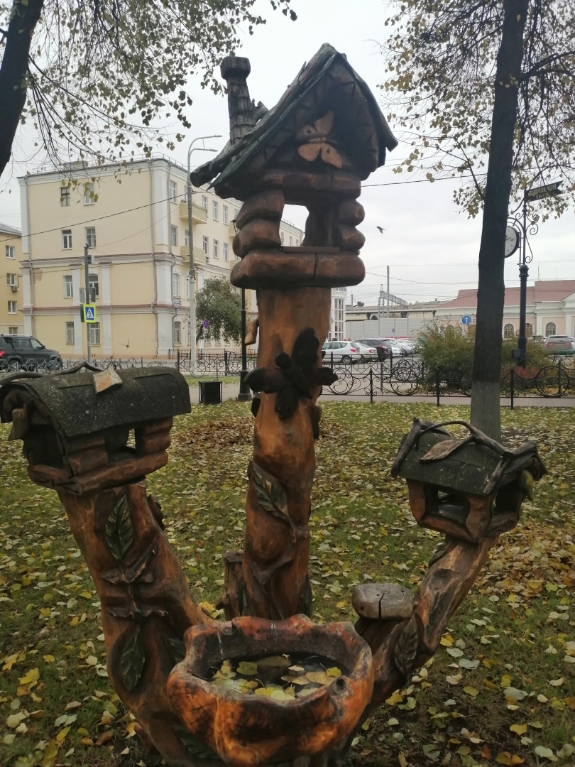 Он добрый. Даже птички свили себе гнездо в его голове. Деревянная скульптура рядом с кафе.
