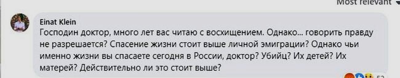 Скорее всего из-за своего украинского происхождения Эйнат люто ненавидит россиян и эта ненависть перешагнула уж все моральные и нравственные пределы. Будучи поклонницей выдающегося нейрохирурга Алексея Кащеева, работающего в университетской клинике МГУ, жена Макаревича написала вот это омерзительное обращение к врачу: