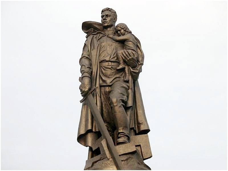 Русский солдат с мечом и немецкой девочкой спасенной на руках