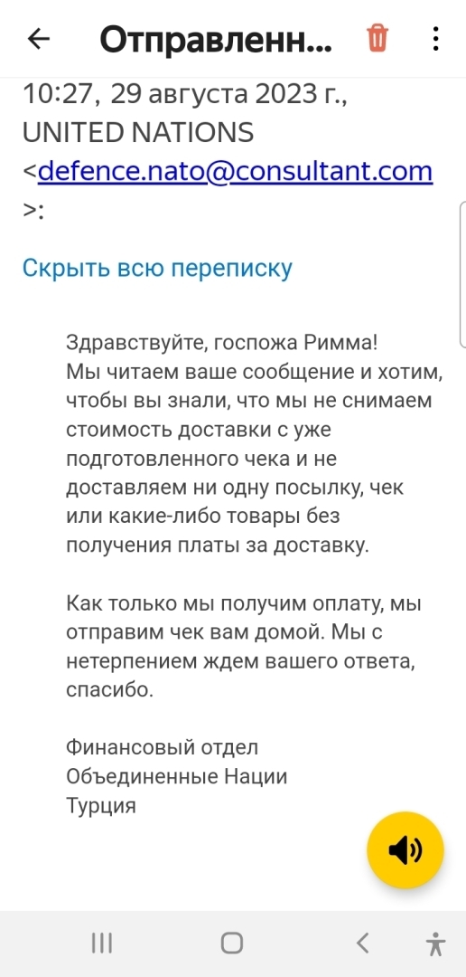 Так и произошло с моим влюблённым. Джеймс Уильям врач педиатр, работающий в Сирии ООН от США Красный крест, продал какое то оборудование Турции по линии ООН тоже, а на деньги 7500 € выписал на моё имя ЧЕК, который Турция привезёт мне на дом. Чек этот мне следует строго хранить до приезда ко мне Джеймса. Но сущая мелочь, за доставку ЧЕКА ко мне домой, я должна Турецкой финансовой компании перевести 700€. Много слов сказано, что чек без данных обо мне недействительный. Все впустую.