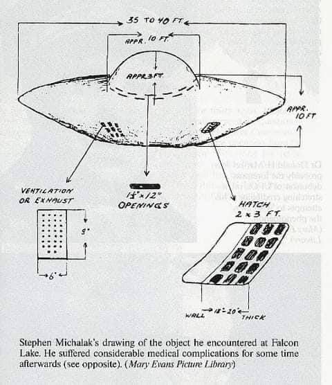 Наблюдая за гусями, Михалак вдруг обратил внимание на два ярко светящихся объекта в небе. Один из них начал вращаться, а другой решил приземлиться в неподалеку, рядом с геологом. Когда Михалак наконец решился подойти ближе к этому загадочному кораблю, он нарисовал его в своем дневнике.