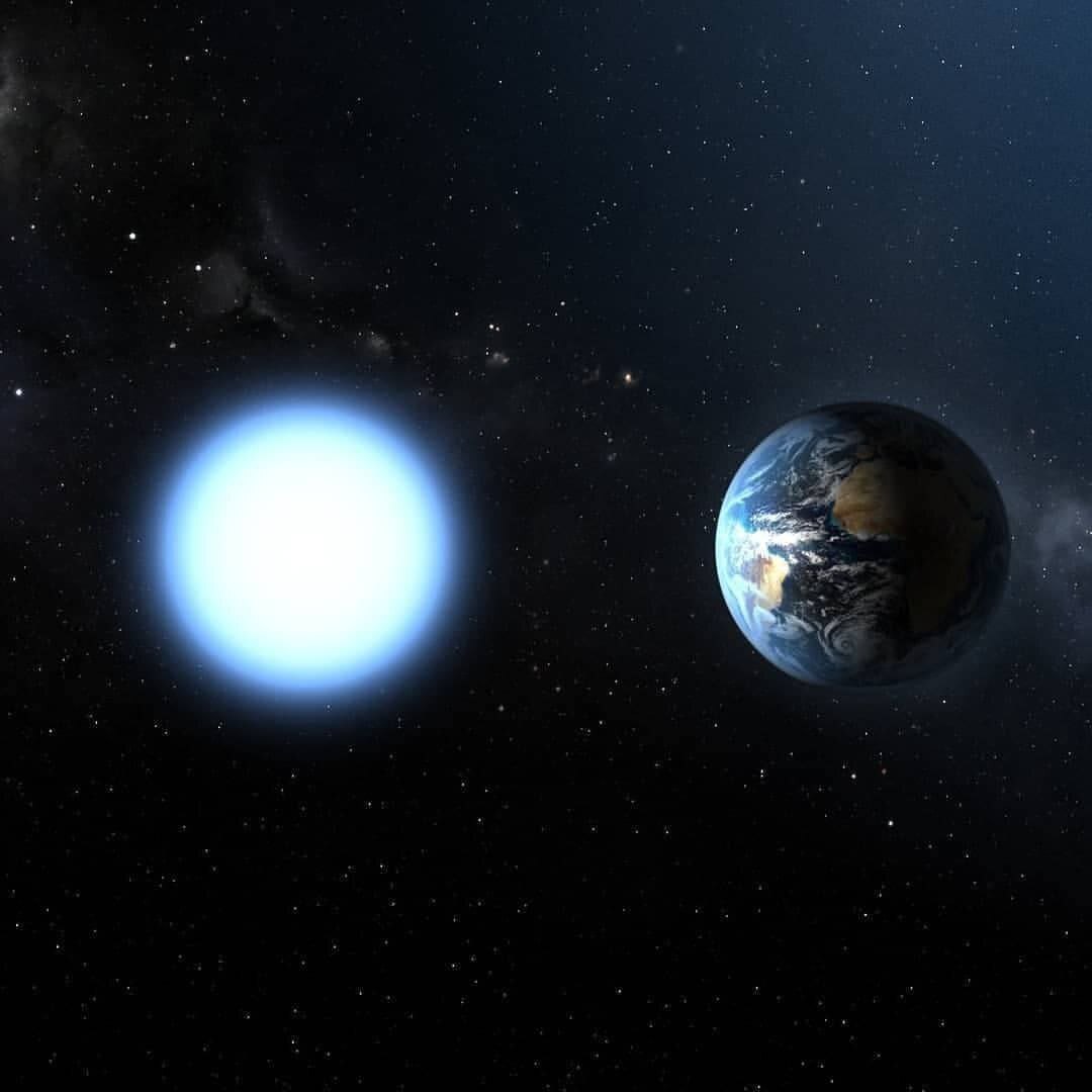 Сравнение размеров Земли и белого карлика, которым станет Солнце после стадии красного гиганта.