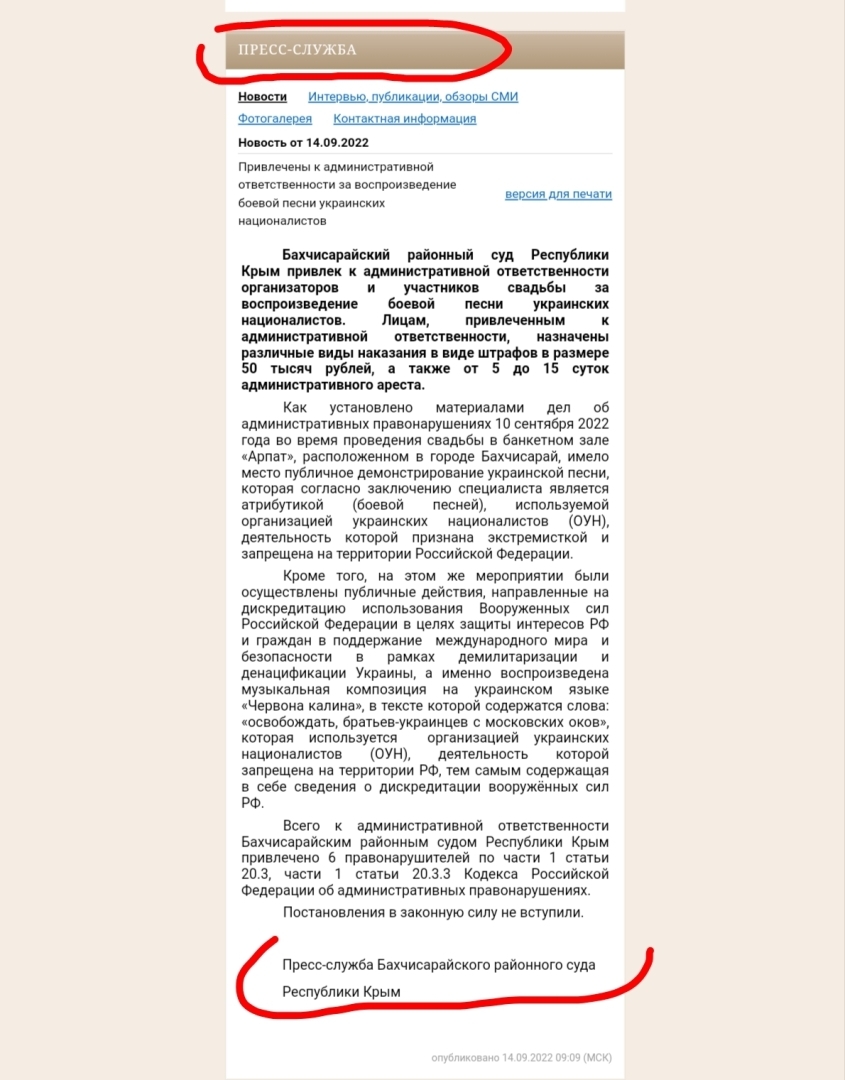 "Как установлено материалами дел об административных правонарушениях 10 сентября 2022 года во время проведения свадьбы в банкетном зале «Арпат», расположенном в городе Бахчисарай, имело место публичное демонстрирование украинской песни, которая согласно заключению специалиста является атрибутикой (боевой песней), используемой организацией украинских националистов (ОУН), деятельность которой признана экстремисткой и запрещена на территории Российской Федерации.