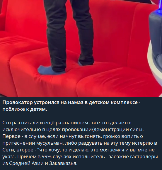 Не даром говорил Ленин! Религия опиум для народа. Да,у нас много национальная страна. Но и уважение никто не отменял. У нас есть в стране и буддисты. Но они не устраивают показанные молебны. Им мечеть построили?! Вот пусть там и молятся. Скоро будут автобусы останавливать. Потому что водителю надо намаз совершить. Раньше я как-то не замечал такого поголовного пренебрежения ни к нам,ни к нашей культуре. А сейчас просто ужас какой-то. Люди конечно правильно сделали что не вмешались. Иначе была бы бойня. Но оставлять такое без внимания тоже не стоит. Я не расист но,поголовное засилье и открытая пропаганда раздражает. Хотя я человек терпеливый. Но и моё терпение не безгранично. Надо решать вопрос. Аккуратно,но эффективно.