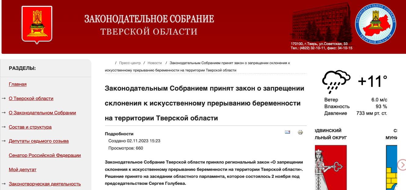Законодательное собрание Тверской области 2 ноября приняло региональный закон, согласно которому за склонение женщин к искусственному прерыванию беременности предусмотрен штраф от 3 тысяч до 200 тысяч рублей.